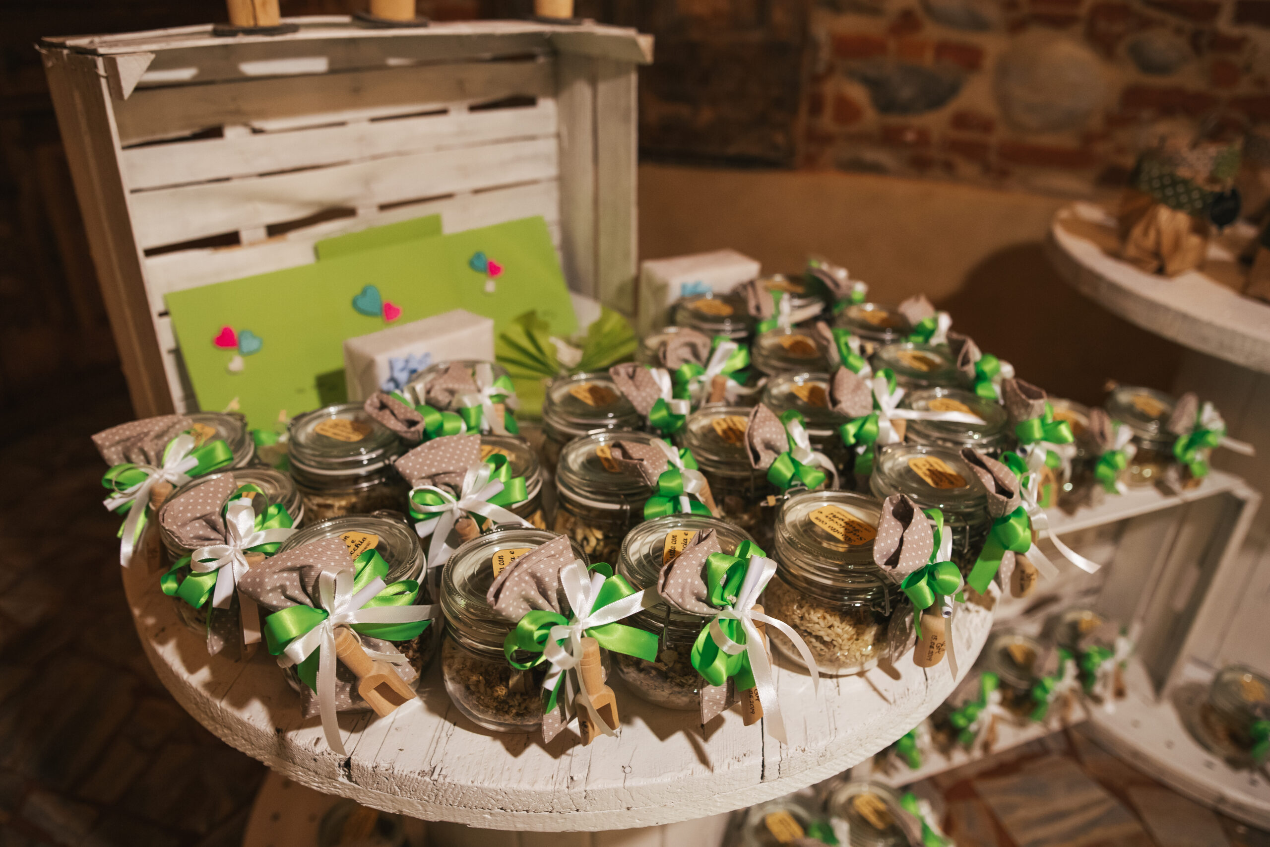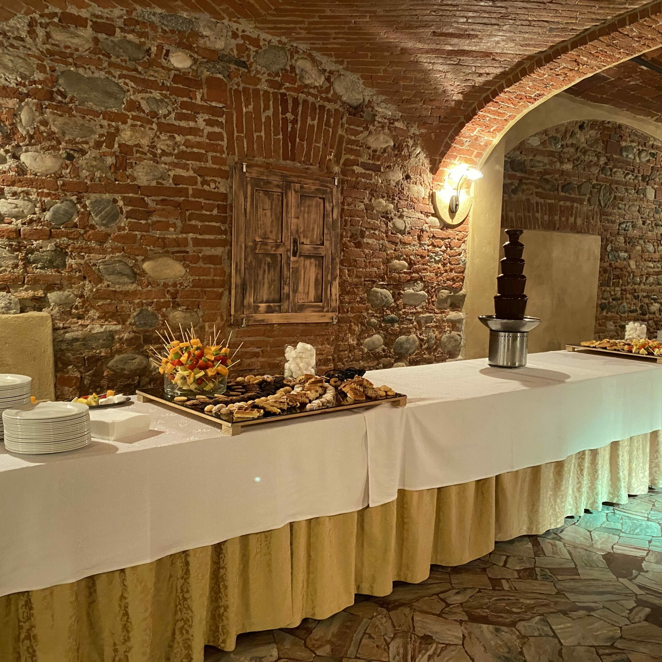 Il grande salone interno, invece, potrà accogliere bellissime mise en place, valorizzate dal connubio di dettagli rustici in mattoncino e le eleganti pareti.